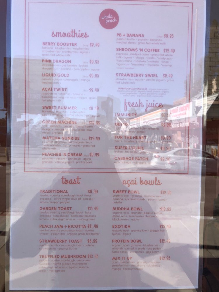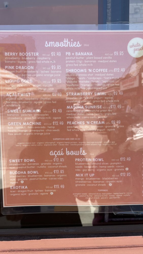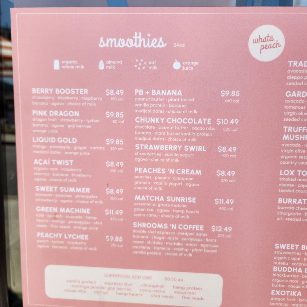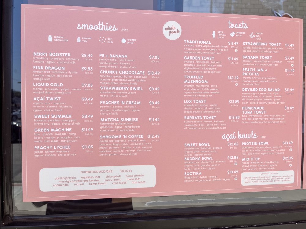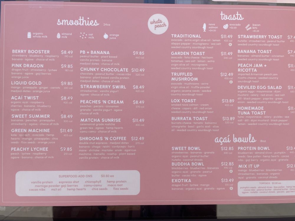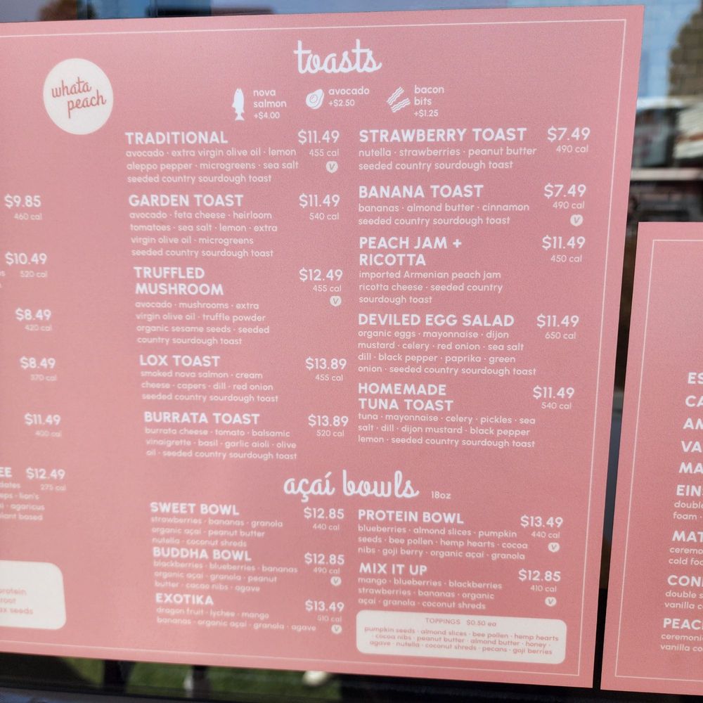 Welcome to Whata Peach, a delightful breakfast and brunch haven nestled in Studio City, CA. This charming eatery specializes in creative toasts and vibrant acai bowls, with standout options like the Truffled Mushroom Toast and the refreshing Buddha Bowl. Pair your meal with one of their innovative coffee creations, such as the luxurious Cookie Butter Latte or the unique Peachy Matcha Latte.